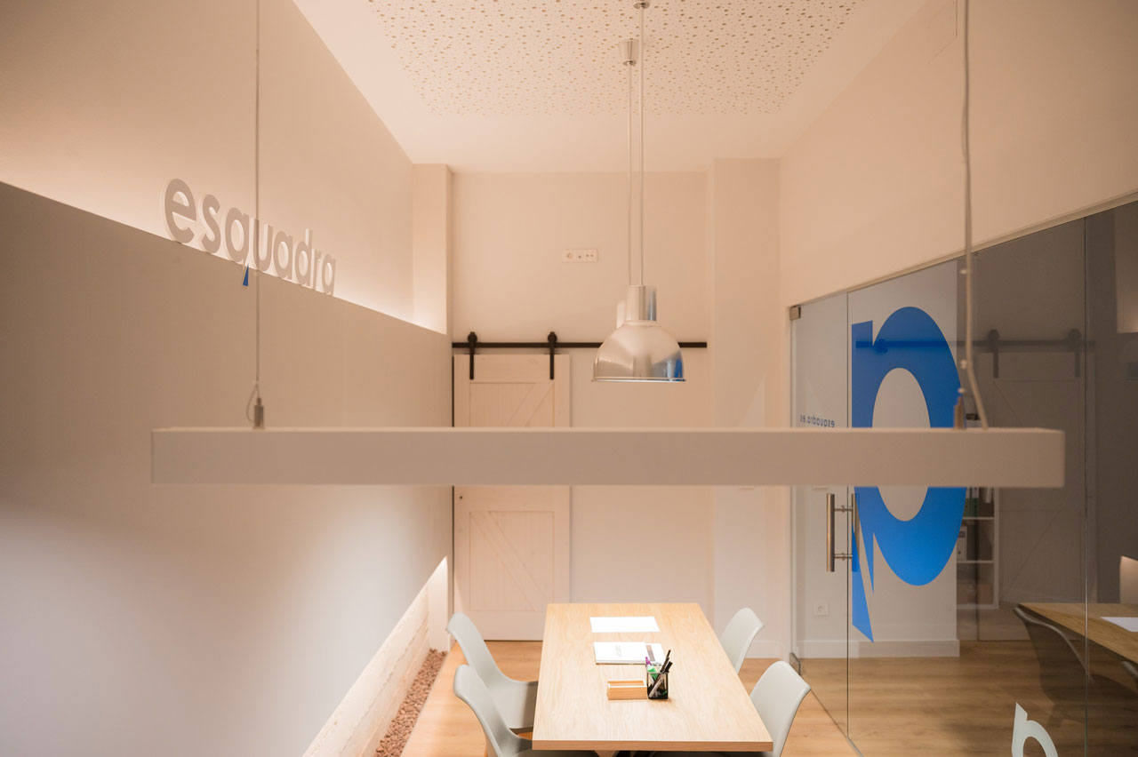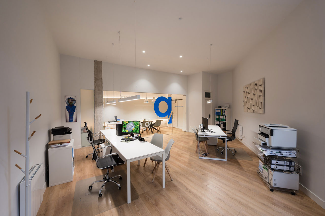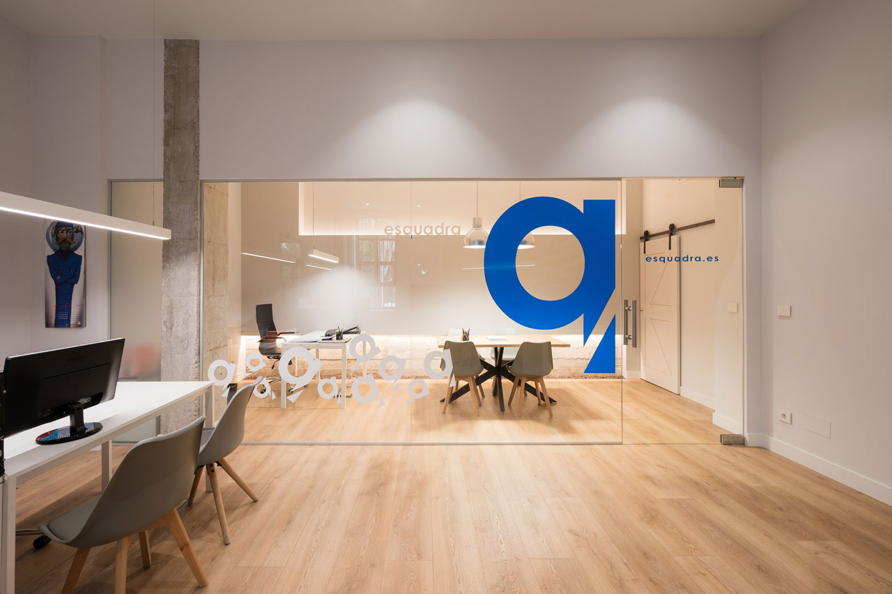 Reforma de local para oficina de una empresa constructora. Reconstrucción integral del local, eliminando todos los acabados y distribuciones previas, suelo laminado en madera, trasdosados de cartón yeso y una gran cristalera para aislar el espacio de reuniones y despacho.