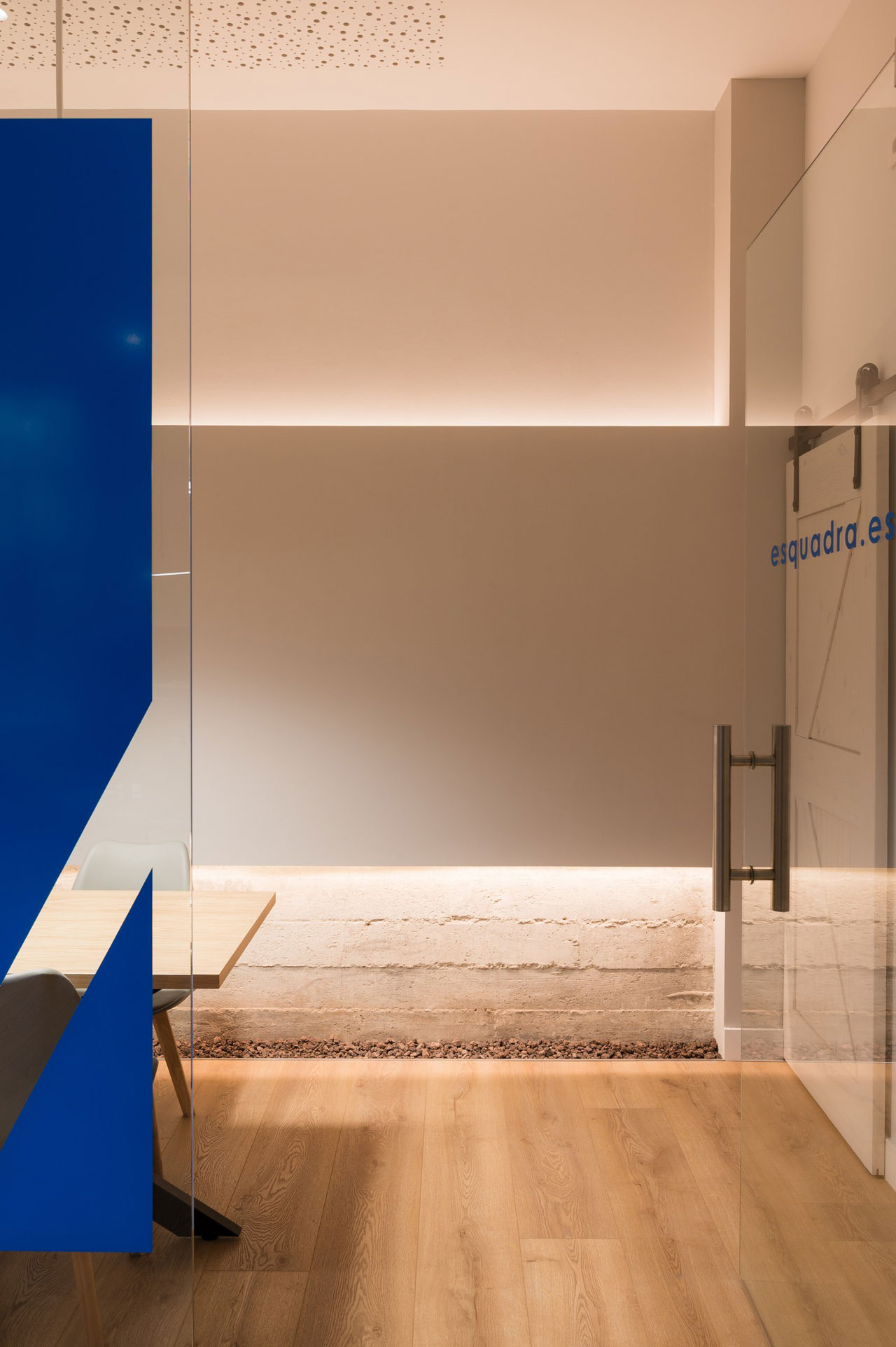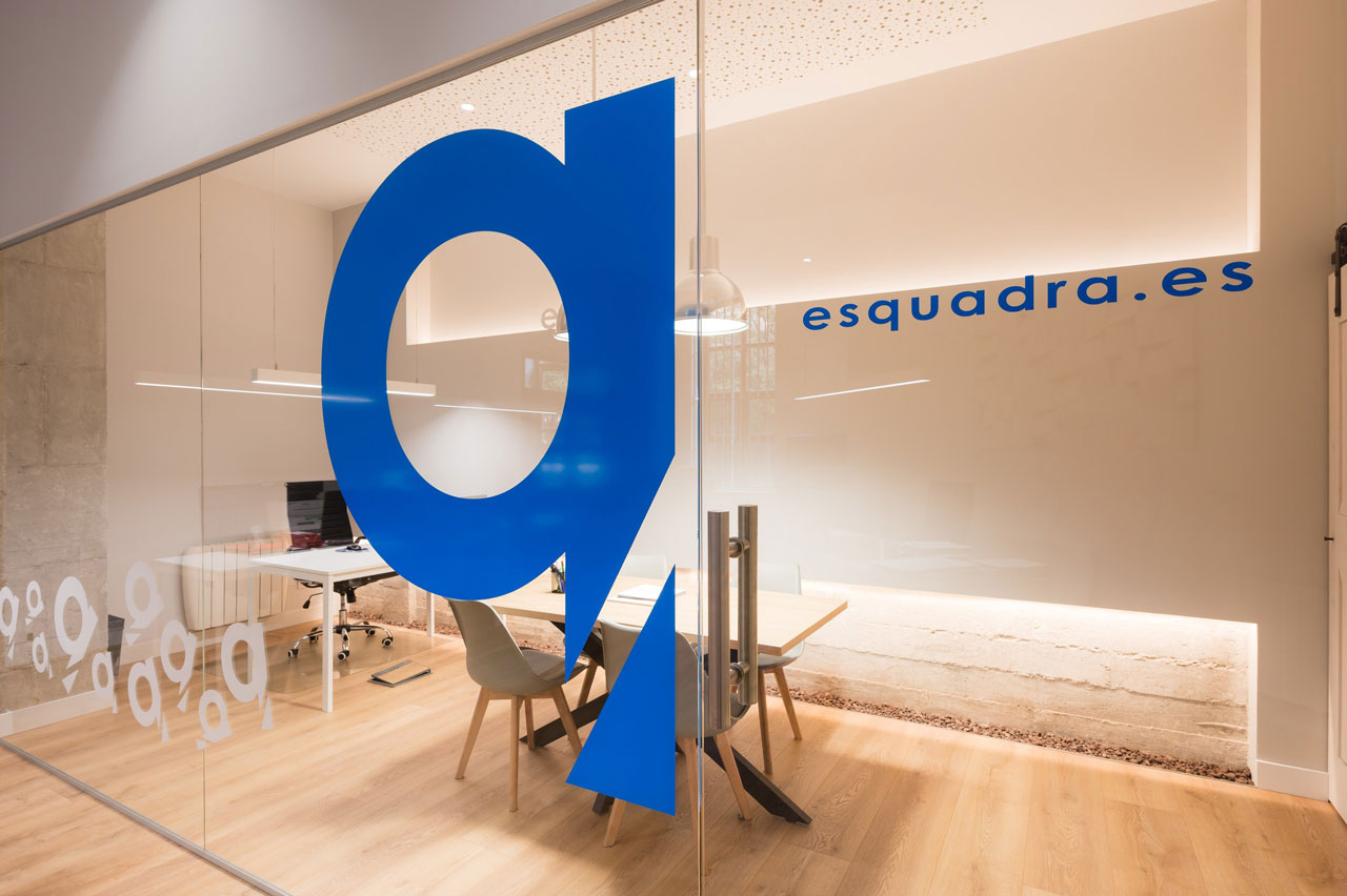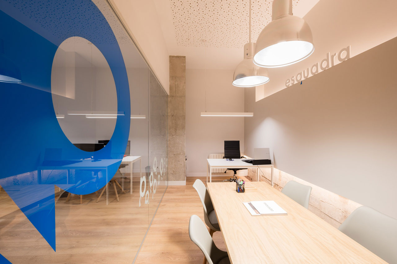 Reforma de local para oficina de una empresa constructora. Reconstrucción integral del local, eliminando todos los acabados y distribuciones previas, suelo laminado en madera, trasdosados de cartón yeso y una gran cristalera para aislar el espacio de reuniones y despacho.