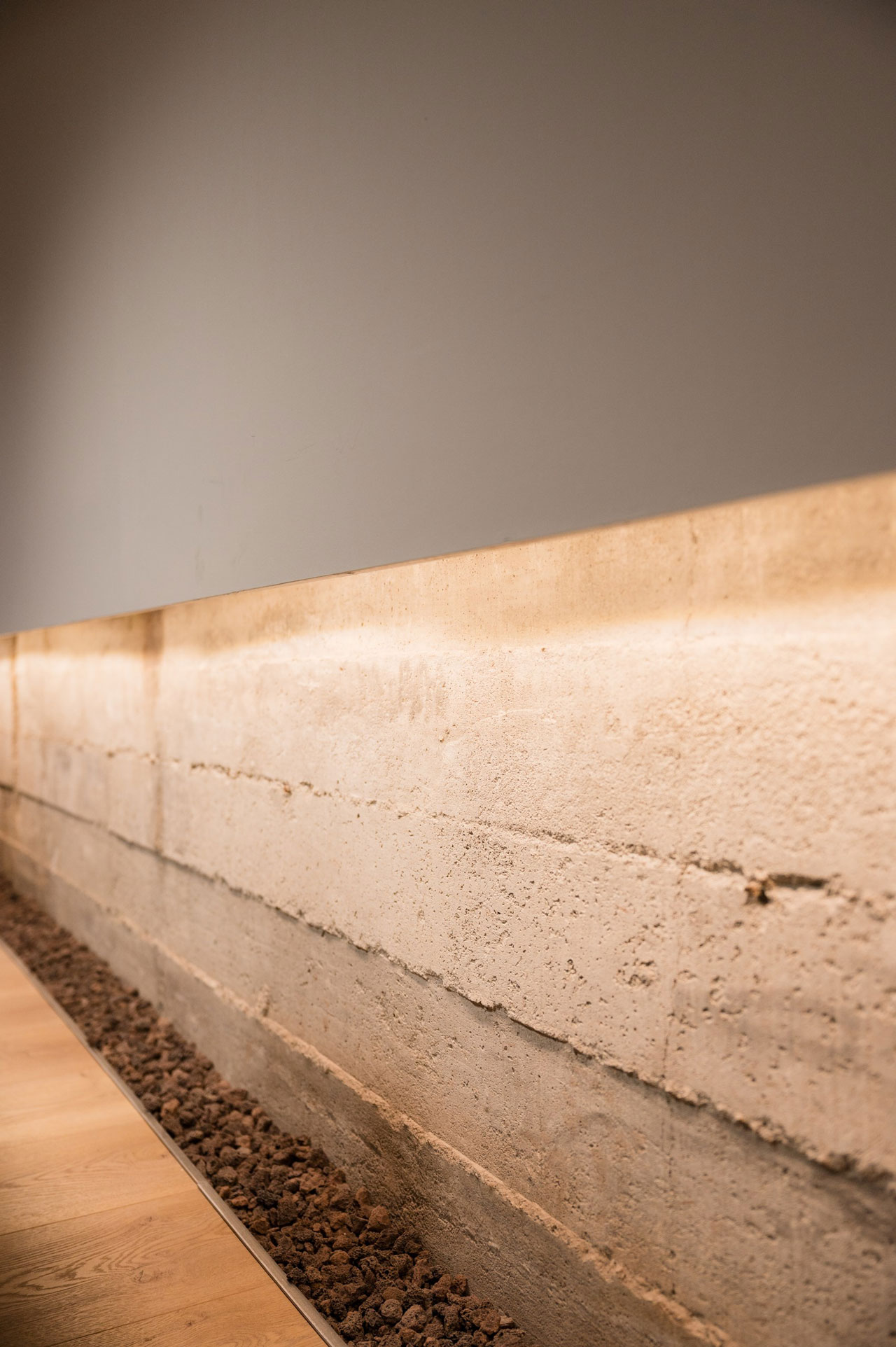 Puntualmente se deja una franja del zócalo de hormigón visto para formar una hornacina decorativa.